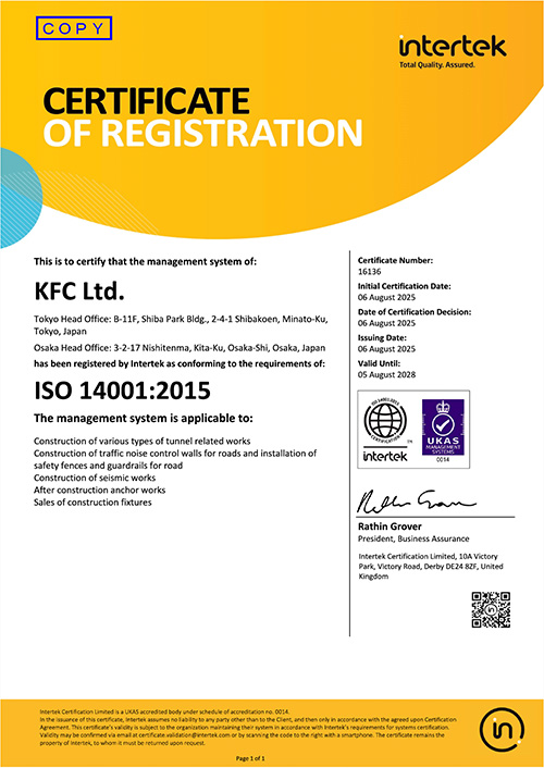 | 認証登録範囲 | トンネル内装の設計及び工事 トンネルの照明設備及び換気設備の据付工事 道路の遮音壁の設計及び工事 道路の防護柵とガードレール等の安全設備工事 トンネル補修のための裏込め注入工事 トンネル耐火性パネル工事 コンクリート構造物のはく落防止対策工事 建築物耐震対策工事 土木構造物耐震対策工事 あと施工アンカー工事 コンクリートアンカー及びその関連部品等の土木 建築用資材の設計及び販売 ロックボルト及びその関連部品等の土木建築用 資材の設計及び販売 トンネル補強のためのロックボルト工事 トンネル用遮水シート、防水シートの施工 |